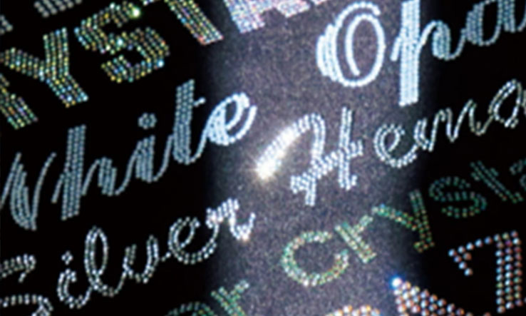 ガラスやアクリル樹脂を用いて作られるラインストーンを生地に熱圧着させる加工です。多彩な色とサイズがあり、独自性のあるデザインを演出できます。