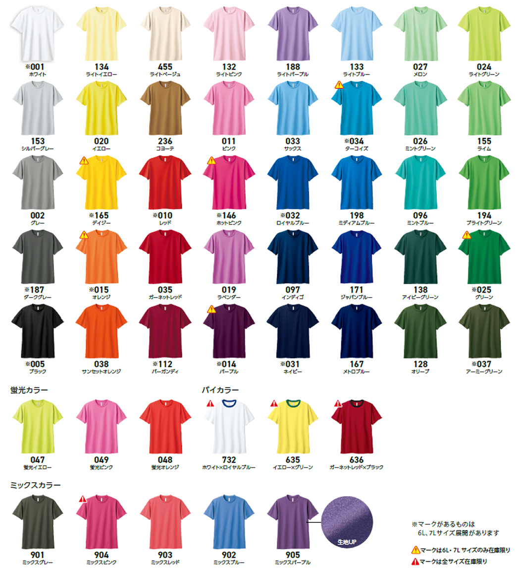 | 価格 | ジュニア(ホワイト&カラー&蛍光カラー 100-150)¥781 税込 (¥710 税別)アダルト(ホワイト&カラー&蛍光カラー WM-WL/SS-LL) ¥809 税込 (¥735 税別)アダルト(ホワイト&カラー&蛍光カラー 3L-5L) ¥941 税込 (¥855 税別)アダルト(ホワイト&カラー&蛍光カラー 6L-7L) ¥1,331 税込 (¥1,210 税別)ジュニア(ミックスカラー 100-150) ¥1,067 税込 (¥970 税別)アダルト(ミックスカラー WM-WL/SS-LL) ¥1,100 税込 (¥1,000 税別)アダルト(ミックスカラー 3L-5L) ¥1,183 税込 (¥1,075 税別)※プリント加工料金は含まれていません。 詳しくは料金表をご確認ください。 |