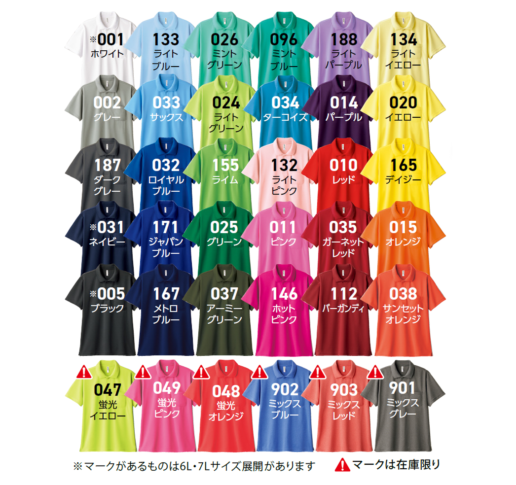 | 価格 | 通常色・蛍光色(SS-LL)¥1,557 税込 (¥1,415 税別)通常色・蛍光色(3L-5L) ¥1,848 税込 (¥1,680 税別)通常色・蛍光色(6L-7L) ¥2,618 税込 (¥2,380 税別)ミックスカラー(SS-LL) ¥2,200 税込 (¥2,000 税別)ミックスカラー(3L-5L) ¥2,591 税込 (¥2,355 税別)※プリント加工料金は含まれていません。 詳しくは料金表をご確認ください。 |